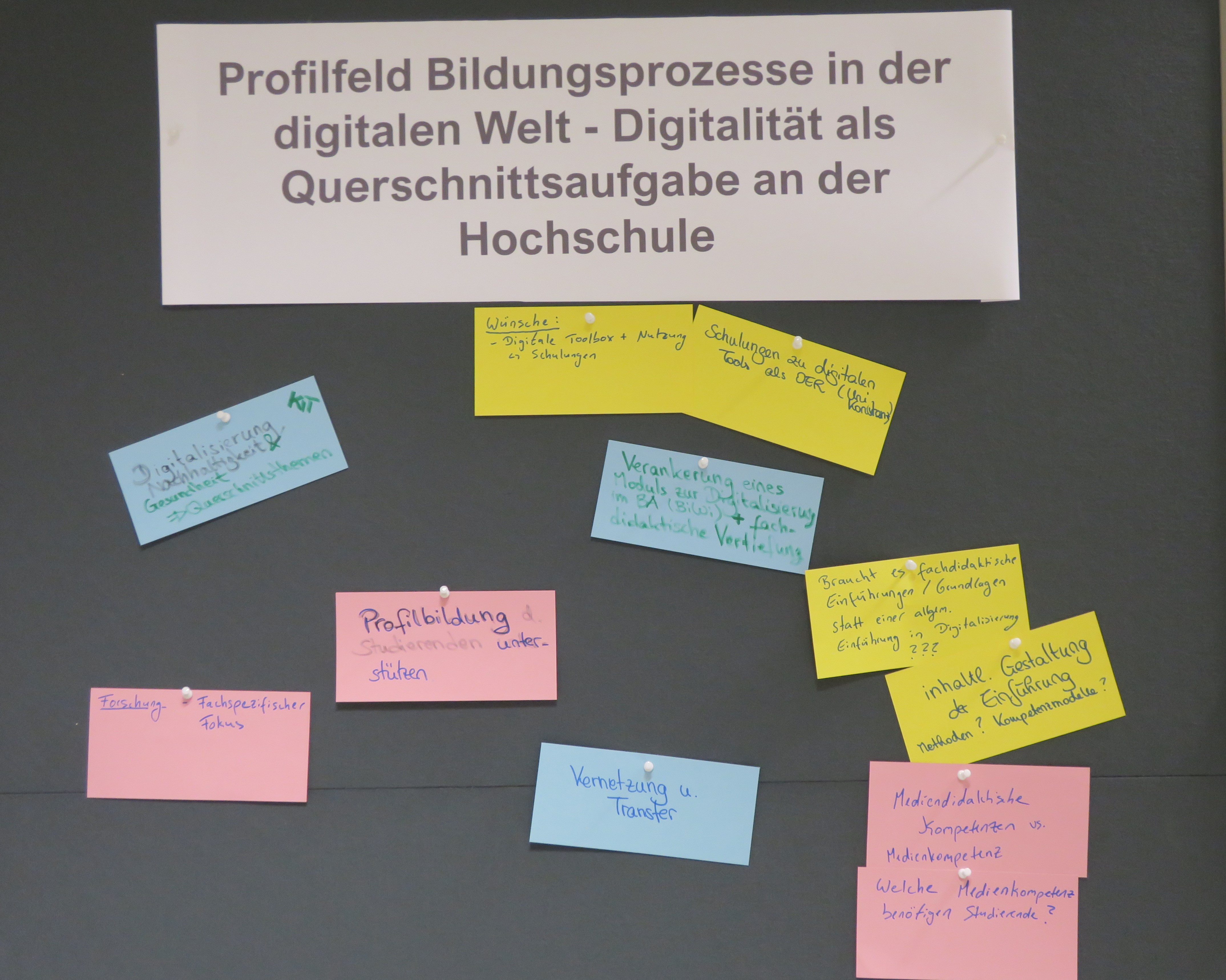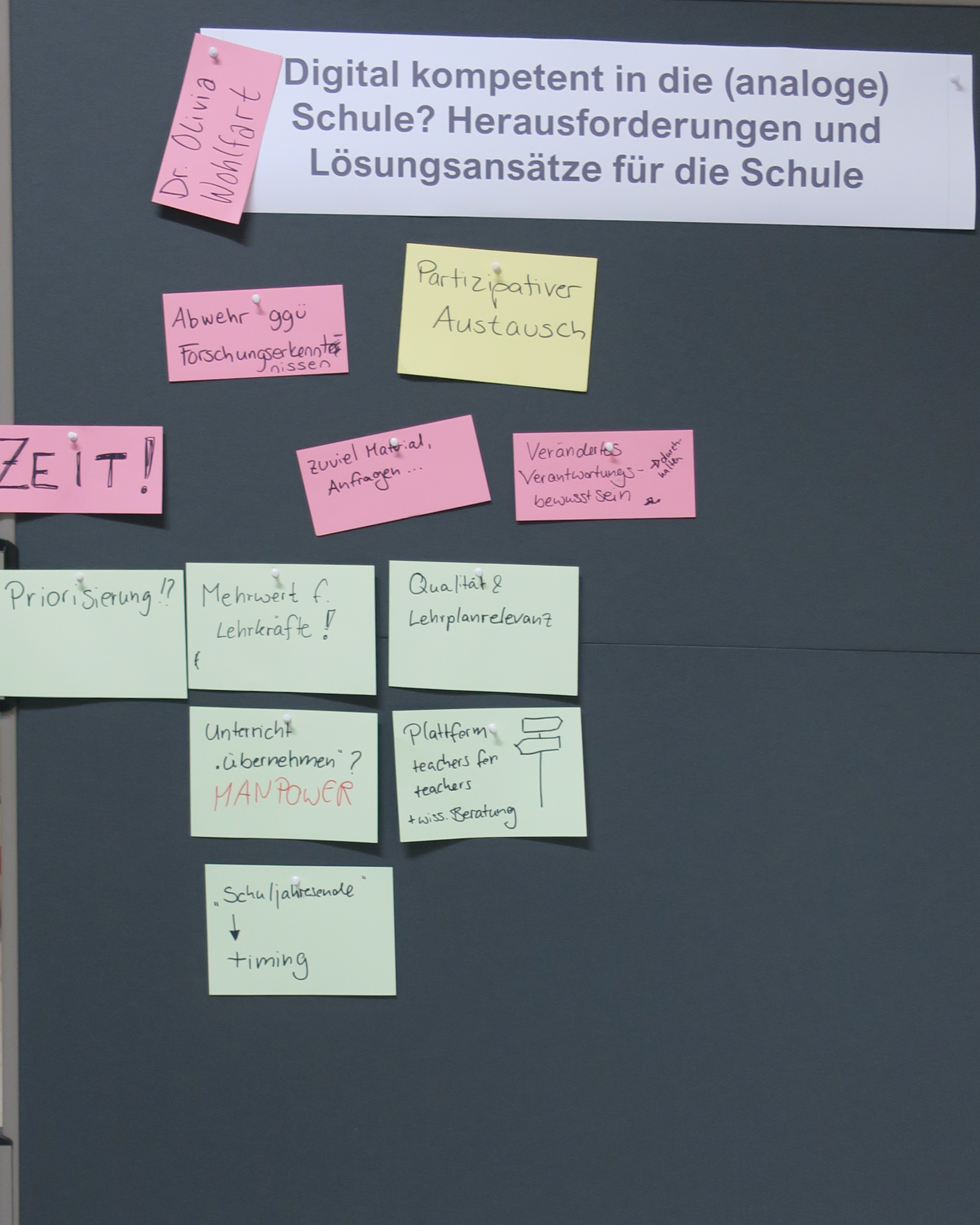 Zum Abschluss wurden die Inhalte von den Moderator:innen geclustert (siehe Fotos der einzelnen Stationen) und die interessantesten Erkenntnisse für Praxis und Forschung präsentiert. Zusammenfassend lässt sich der Wunsch alles Akteursgruppen nach mehr Austausch, der Berücksichtigung des jeweiligen Kontextes (Schule vs. Hochschule; Fachspezifität) sowie Best-Practice-Beispielen hervorheben. Die Gäste haben das Café motiviert und mit neuen Impulsen verlassen. Die Gastgeberinnen der Projekte digiMINT und InDiko stehen nun wiederum vor der Herausforderung, mit den Fragen und Anregungen der Gäste entsprechend umzugehen und diese in der Forschung zu berücksichtigen.